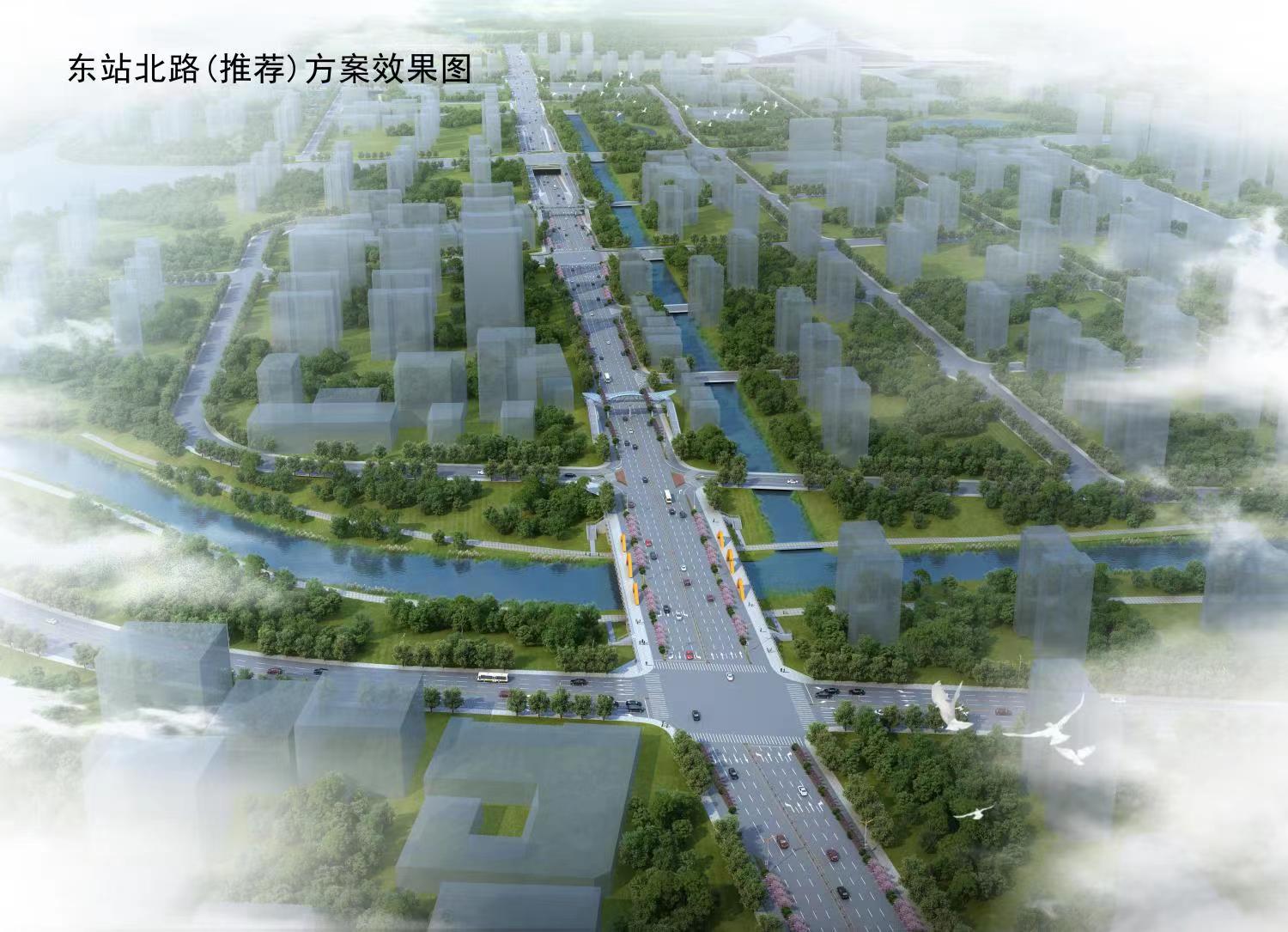 2)东站北路西起罗家中路,东至站前一路,全长3200m,规划为城市次干路,道路红线宽36m,双向6车道,设计速度为40km/h。