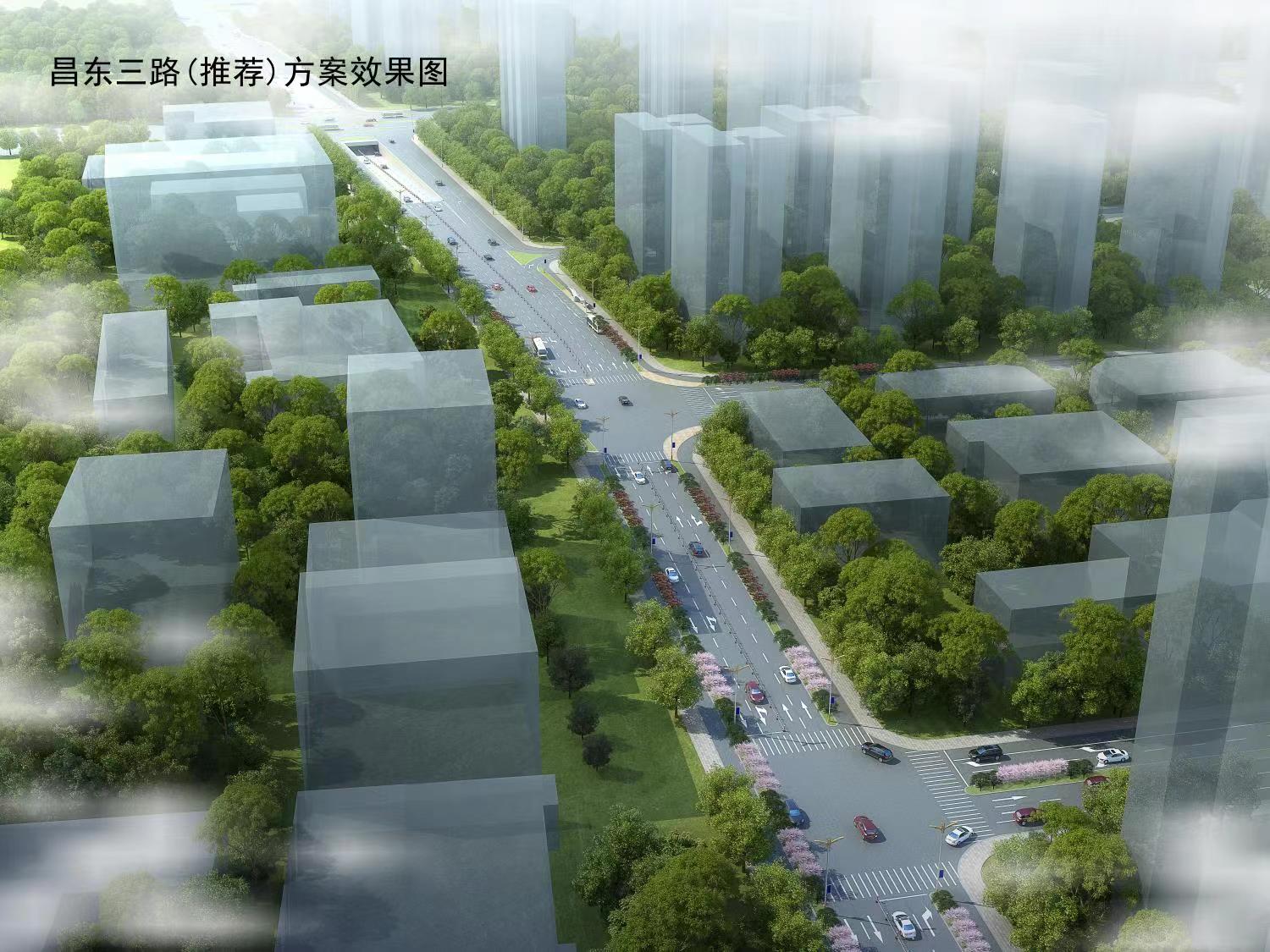 6)昌东三路西起胡板路,东至站前三路,全长812m,规划为城市次干道,道路红线宽为32m,双向4车道,设计速度为40km/h。